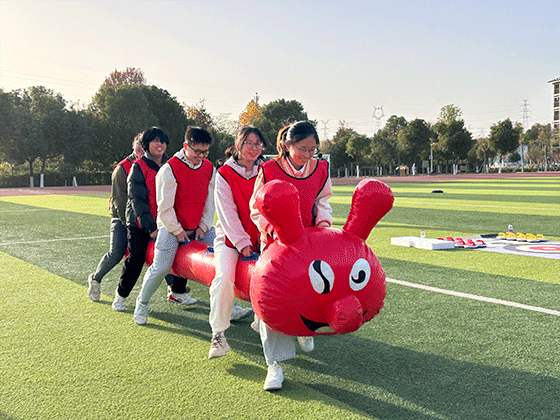 活动在轻松愉快的热身环节中拉开序幕。同学们通过“按摩操”“名声飞扬”等破冰游戏迅速打破隔阂,现场气氛活跃,笑声不断。随后进行的“趣味毛毛虫”项目将同学们分为若干小组,每组队员需骑在比赛器材上协调行进。比赛中,大家齐心协力、步调一致,展现出强烈的团队合作精神与默契配合。通过这一环节,同学们深刻体会到沟通与协调在集体中的重要性。
