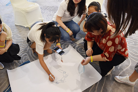 在活动开始,胡老师通过“异掌同声”、“新朋友手拉手”、“认识新朋友”等活动,让志愿者们活用身体和语言,让大家快速熟悉彼此。志愿者不仅是个人的社会身份,更是对一个集体、一类人群的称呼。在接下来的活动中,胡老师变大集体为小组,志愿者们以小组为单位完成不同的任务和挑战,在活动中更加理解和明晰团队与合作的内涵。在“团队建立”的活动中,小组初步形成;“同心鼓”的游戏则是对团队凝聚力的试炼和升华,充分激发志愿者们对团队的认可和归属。